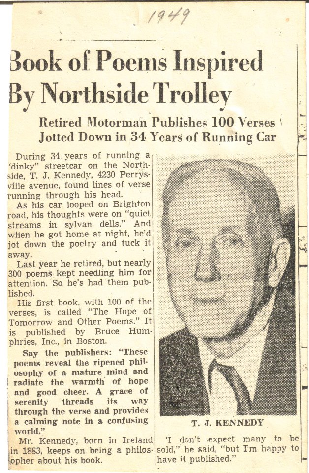 My Great-Grandfather T.J. Kennedy wrote a book called The Hope of Tomorrow and Other Poems. In November 2014 I was given a copy by his daughter’s daughter Peggy Carlson to cherish – which I plan to do forever!