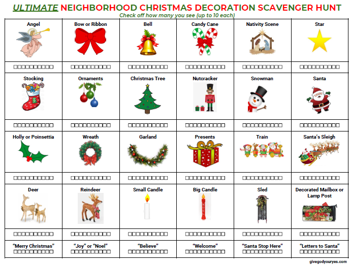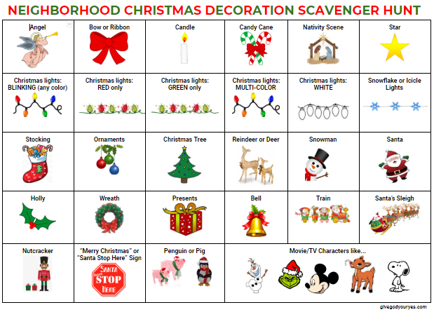 Whether you walk or drive around this Christmas season to check out the festive sights be sure to bring along this Neighborhood Christmas Decoration Scavenger Hunt. And feel free to sing carols along the way.