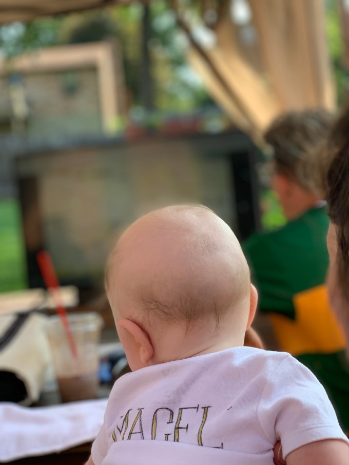 I was sitting with Ruthie and she was just being a cute baby. And I noticed how her hair is coming in. Her baby hair went thru a transition of being shed/rubbed off and is now back to growing again – and it must have passed some point of growth which made me to realize “Oh look her hair is coming in.”